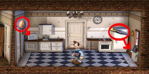 ist ab in die Küche.Das Ei aus dem Kühlschrank holen und in die Mikrowelle platzieren und die Seife auf den Küchenboden legen. Wir gehen nach unten wenn der Nachbar im Wohnzimmer