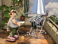 Soße mit der rechten Maustaste mit den Zähnen im Glas. Das gibt eine "feurige Mischung, hehe!Nun schleichen wir nach unten in die Küche und verwenden das Nitroglyzerin mit dem Milchfläschchen und die Feuerkekse mit der Keksdose. Ab nach unten und den Schlüssel mit dem Käfig benutzen. Nun geht es nach oben ins Schlafzimmer, die Bananenschale mit dem Boden benutzen und die Reißnägel mit dem Bett benutzen. Jetzt geht es auf den Balkon und wir genießen die weitere Show. |